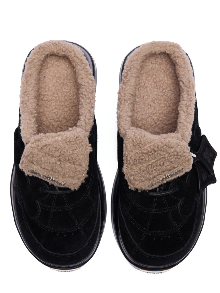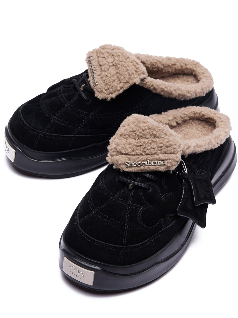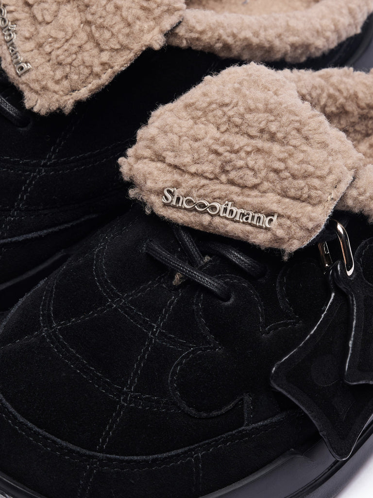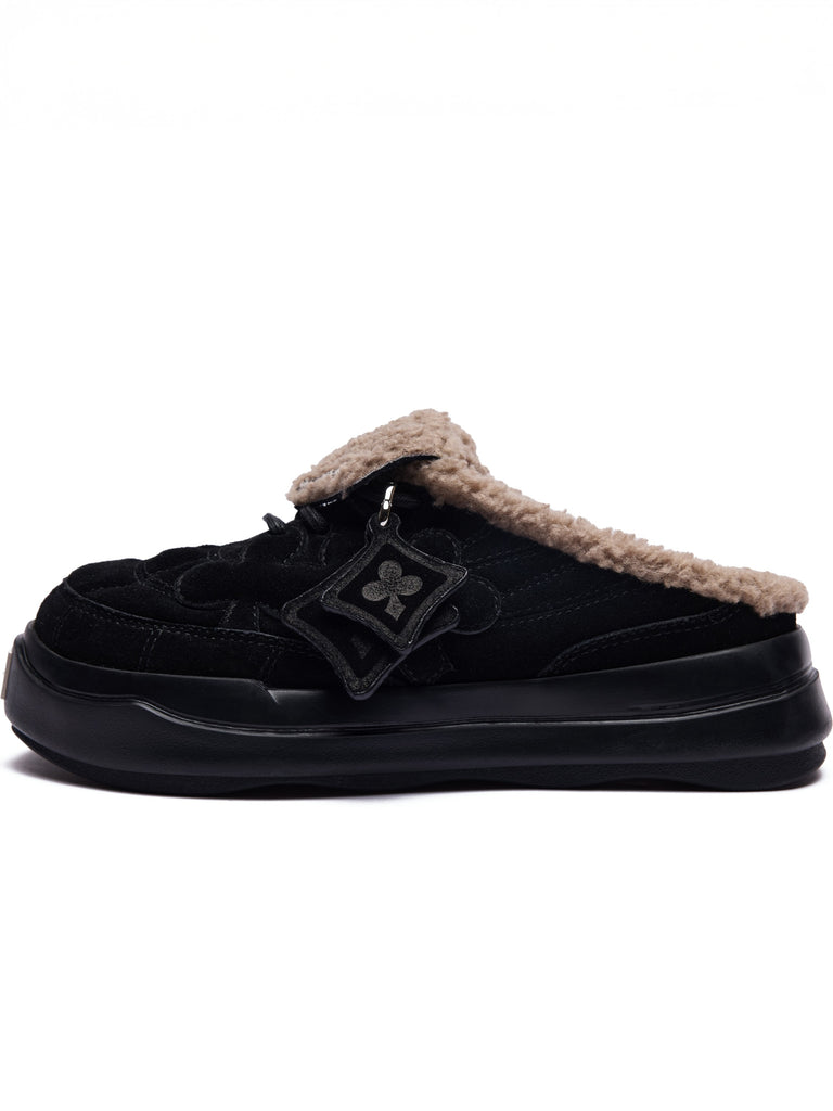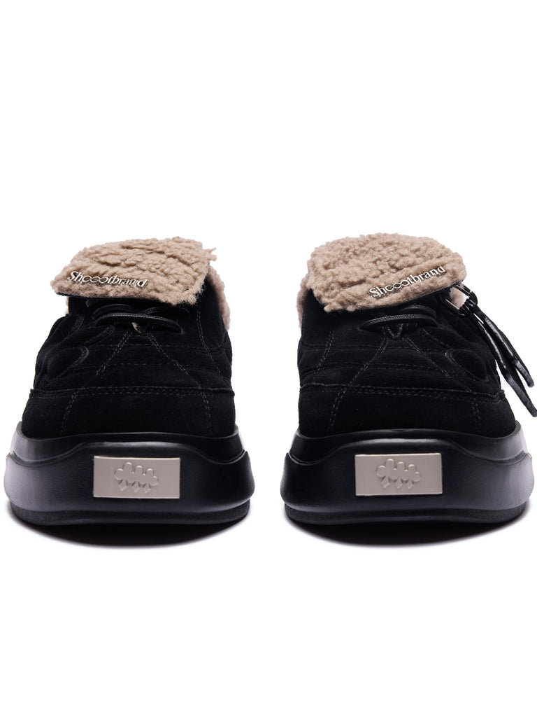 The Random Low 'Stout' sneaker is crafted from black premium calfskin leather and soft suede with a cozy faux shearling lining. Designed with a slip-on clog-inspired silhouette for effortless wear. Features a stainless steel logo plaque at the toe and contrast-stitched plum logo at the sides. The custom wavy platform sole offers a 4.5cm rise with signature SHOOT accents.